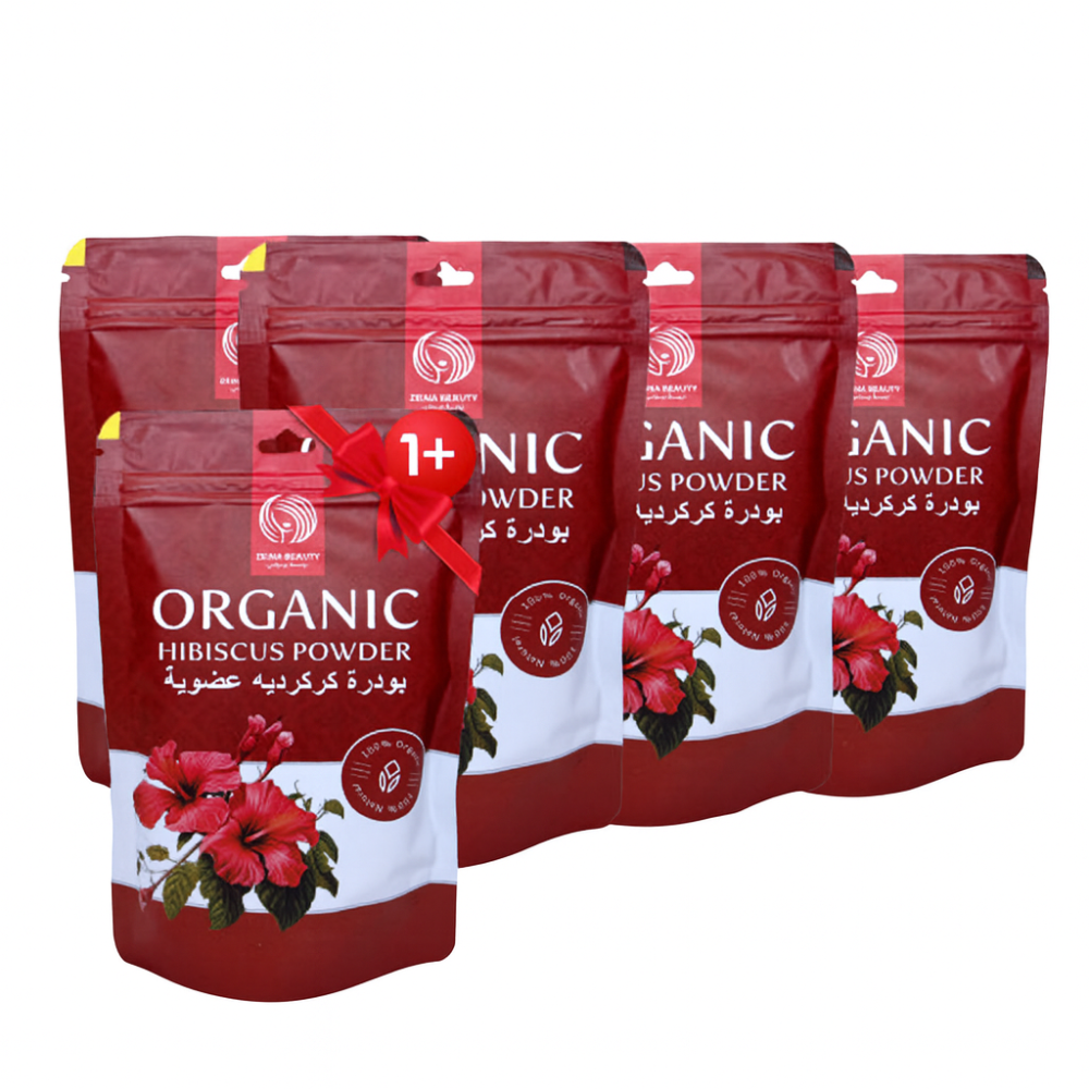 - 5 عبوات × 100 جم = إجمالي 500 جم من بودرة الكركديه العضوية